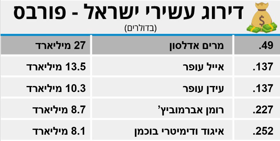 דירוג עשירי ישראל על פי מגזין 'פורבס': מרים אדלסון היא האישה הישראלית העשירה ביותר, מזנקת למקום ה-49 עם עלייה משמעותית, אייל עופר ממשיך לנסוק. ומה קורה עם רומן אברמוביץ'?