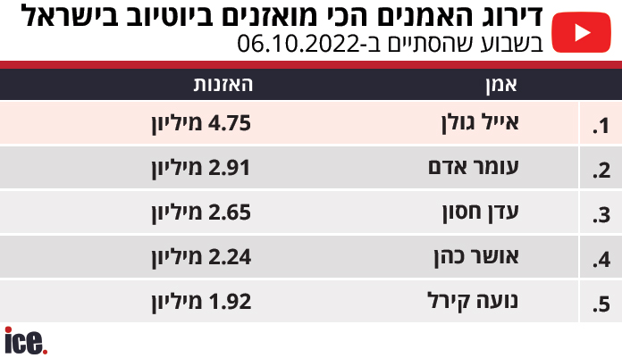 טבלת האמנים הנצפים בישראל לא השתנתה משמעותית מבחינת דירוג הצמרת, למרות שינויים משמעותיים במספרים: אייל גולן במקום הראשון, כרגיל, למרות ירידה של 10%, שעדיין לא מצליחה להוריד את ההפרש בינו לבין עומד אדם להרבה פחות מ-2 מיליון צפיות; אדם עצמו ירד בכ-6% במספר הצפיות השבועי, אך שומה על הפרש של כרבע מיליון צפיות מעל עדן חסון, שרשם עלייה קלה ונשאר במקום השלישי; ברביעי דורך אושר כהן, עם ירידה של 7%; ובחמישי נועה קירל, עם צניחה של כ-19.5%.