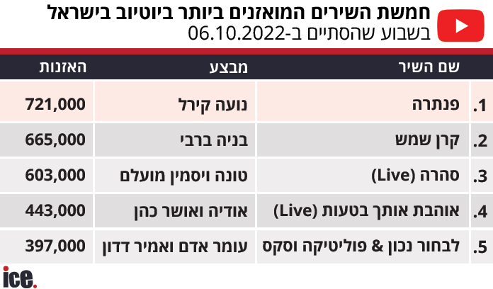 הלהיט התורן של נועה קירל, "פנתרה", ספג בשבוע שעבר צניחה של כמעט 30% במספר הצפיות השבועי ביוטיוב, ל-721,000 בלבד לעומת מיליון בשבוע של ראש השנה. למרות זאת, הוא שמר על המקום הראשון ברשימת השירים הנצפים בישראל שמפרסם שירות הווידאו של גוגל. זאת בזכות ההפרש העצום בינה לבין כל יתר השירים בשבוע שעבר, שאיפשר לה להישאר בראש גם עם נתון נמוך בהרבה.