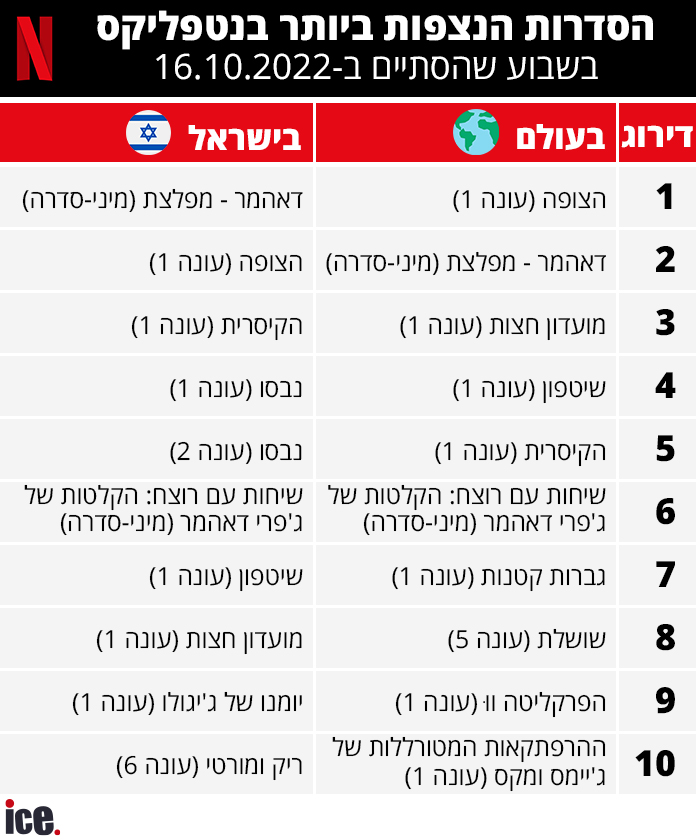 בשני המקומות הראשונים, גם בעולם וגם בישראל, נמצאות המיני-סדרה העלילתית על דאהמר והסדרה החדשה "הצופה", על משפחה שעוברת לבית חלומותיה, רק כדי לגלות שתיאור מתאים יותר לבית יהיה מעורר סיוטים; במקום השלישי בעולם, והשמיני בישראל, "מועדון חצות", על בני נוער גוססים שעושים עסקה מוזרה ומטרידה לתקשר מהעולם הבא; "שיטפון" הפולנית, על אסון טבע נדיר שהורס את חייהם של תושבי עיר מודרנית לכאורה, במקום הרביעי בעולם והשביעי בישראל; במקום השישי, גם בעולם וגם בישראל, הסדרה הדוקומנטרית על דאהמר; ובמקום השביעי "גברות קטנות", על שלוש אחיות קוריאניות שמסתבכות בקונספירציה רחת היקף.