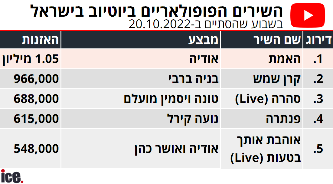 לא הרבה זמרים ישראלים יכולים להתפאר בהישג הזה - וכעת מצטרפת אליהם אודיה אזולאי, המוכרת פשוט כאודיה. בשבוע שהסתיים ביום חמישי האחרון נוגן השיר החדש של, "האמת", מעל מיליון פעמים ביוטיוב, מה שהציב אותה במקום הראשון ברשימת השירים הפופולאריים בישראל בשירות הווידאו הגדול בעולם - זינוק משמעותי לעומת המקום החמישי בשבוע שקדם לכך, עם גידול של פי שניים ורבע בצפיות.