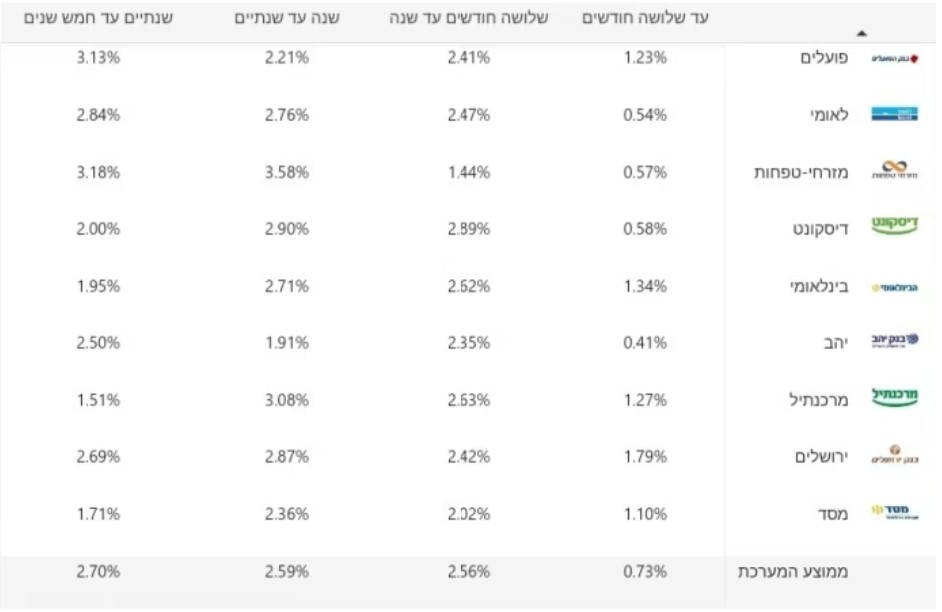 בתקופה של שלוש עד חמש שנים, הממוצע עומד על 2.70% בלבד, אבל שוב זה בנק מזרחי טפחות שבמקום הראשון עם ריבית של 3.18% בסך הכל, כאשר את המקום האחרון תופס מרכנתיל עם 1.51% בסך הכל.
