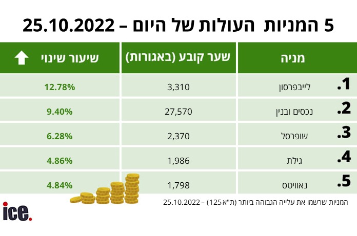בראש פסגת המניות העולות ניתן למצוא את לייבפרסון, שזינקה ב-12.78% בדרך לשער חדש של 3,310 אג', נכסים ובנין עלתה ב-9.40% בדרך ל-27,570 אג', שופרסל עלתה ב-6.28% בדרך ל-2,370 אג', גילת טיפסה ב-4.86% בדרך לשער של 1,986 אג', סוגרת את החמישייה נאוויטס שעלתה ב-4.84% בדרך ל-1,798 אג'.
