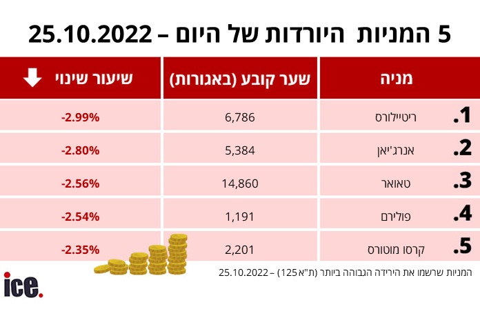 בראש פסגת המניות היורדות ניצבת ריטיילורס של הראל ויזל שירדה ב-2.99% בדרך ל-6,786 אג', אנרג'יאן ירדה ב-2.80% ל-5,384 אג', טאואר רשמה ירידה בשיעור של 2.56% ל-14,860 אג', פולירם במקום הרביעי עם צניחה של 2.54% ל-1,191 אג', סוגרת את החמישייה קרסו מוטורס ירד ב-2.35% ל-2,201 אג'.