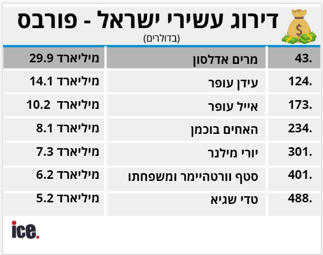 יורי מילנר נותר יציב עם הון מוערך ב-7.3 מיליארד דולר ומקומו בטבלה העולמית עומד על המקום ה-301. סטף ורטהיימר ומשפחתו הם הקופה הישראלית השביעית בגודלה בעולם וממוקמים השבוע במקום ה-401. טדי שגיא, הישראלי השמיני העשיר בעולם במקום ה-488 עם הון מוערך בכ-5.2 מיליארד דולרים.