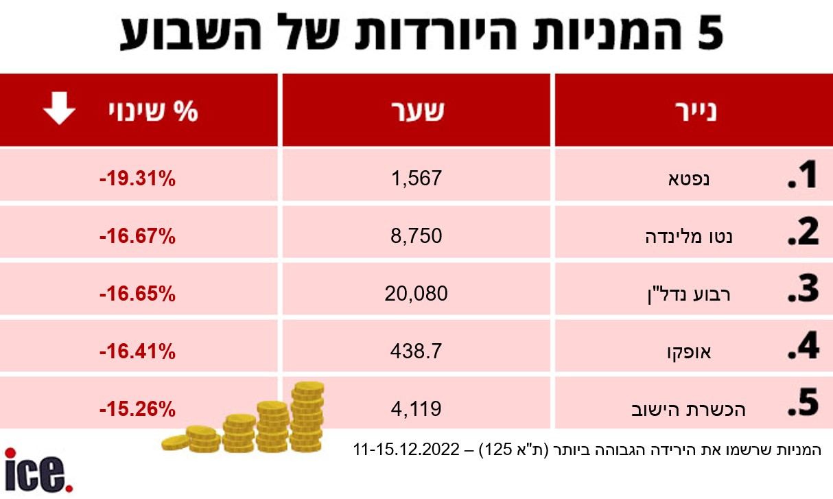 חברת חיפושי הנפט נפטא צנחה בשיעור חד של 19.31% למחיר של 1,567 אג'; ענקית המזון נטו מלינדה נפלה בשיעור של 16.67% למחיר של 8,750 אג'; חברות הנדל"ן הרבוע הכחול נדל"ן והכשרת הישוב רשמו ירידות בשיעורים של 16.65% ו-15.26% למחירים של 20,080 ו-4,119 אג'; ואופקו הלת' ירדה בשיעור של 16.41% למחיר של 438.7 אג'.