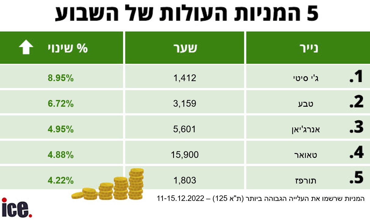 ענקית המרכזים המסחריים ג'י סיטי מסכמת את השבוע בעלייה של 8.95% למחיר של 1,412 אג'; טבע עולה בשיעור של 6.72% למחיר של 3,159 אג'; אנרג'יאן עולה בשיעור של 4.95% למחיר של 5,601 אג'; חברת השבבים טאואר, שנרכשה בשנה שעברה על ידי אינטל, רושמת עלייה בשיעור של 4.88% למחיר של 15,900 אג'; וחברת תרכובות המזון והקוסמטיקה תורפז עולה בשיעור של 4.22% למחיר של 1,803 אג'.