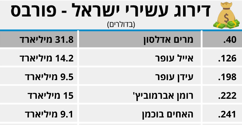 דירוג עשירי העולם של מגזין פורבס פורסם: מרים אדלסון אמנם הפסידה השבוע, אך קפצה למקום ה-40 ונכנסה לרשימה מכובדת, גם האחים עופר רשמו הפסדים לא קטנים. ומה עשה רומן אברמוביץ'?
