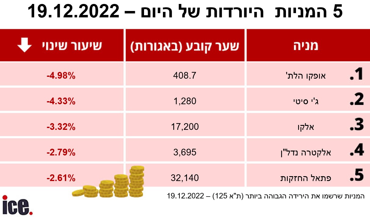 חברת המחקר הרפואי אופקו ירדה בשיעור של 4.98% למחיר של 408.7 אג'; מנהלת מרכזי הקניות ג'י סיטי ירדה בשיעור של 4.33% למחיר של 1,280 אג'; אלקו וחברת-הבת שלה, אלקטרה נדל"ן, רשמו ירידות בשיעורים של 3.32% ו-2.79% למחירים של 17,200 ו-3,695 אג', בהתאמה; ופתאל החזקות ירדה בשיעור של 2.61% למחיר של 32,140 אג'.