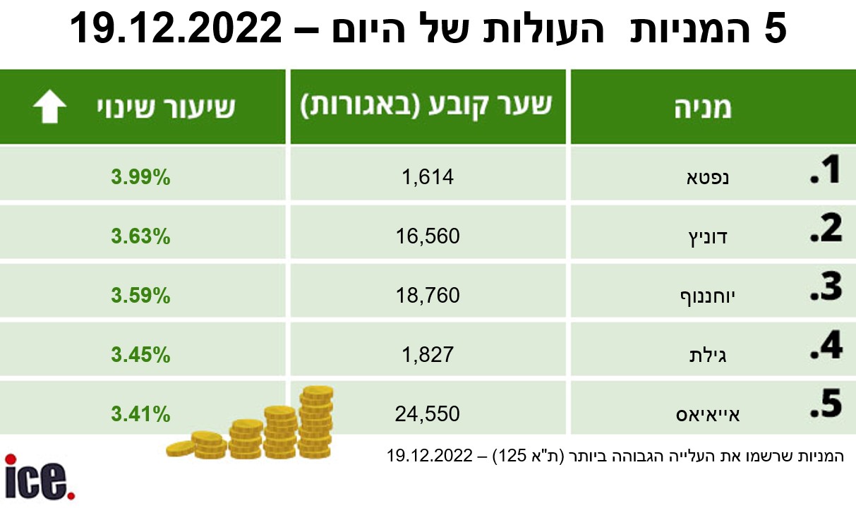 חברת חיפושי הדלקים נפטא רשמה את העלייה היומית הגבוהה ביותר, בשיעור של 3.99%, למחיר של 1,614 אג'; חברת הנדל"ן של האחים דוניץ עלתה בשיעור של 3.63% למחיר של 16,560 אג'; רשת הקמעונות יוחננוף עלתה בשיעור של 3.59% למחיר של 18,760 אג'; חברת תקשורת הלוויינים גילת רשמה עלייה בשיעור של 3.45% למחיר של 1,827 אג'; ואייאיאס, המקימה תשתיות לענף התעופה, עלתה בשיעור של 3.41% למחיר של 24,550 אג'.