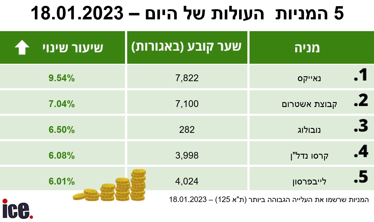 רשימת העליות היומית כוללת לא מעט תנודות דרמטיות למדי: ספקית פתרונות הסליקה נאייקס זינקה בשיעור של 9.54% למחיר של 7,822 אג'; קבוצת אשטרום רשמה עלייה חדה בשיעור של 7.04% למחיר של 7,100 אג'; חברת שירותי הרפואה נובולוג עלתה בשיעור של 6.5% למחיר של 282 אג'; קרסו נדל"ן עלתה בשיעור של 6.08% למחיר של 3,998 אג'; וחברת תוכנת התקשורת לאתרי אינטרנט לייבפרסון עלתה בשיעור של 6.01% למחיר של 4,024 אג'.
