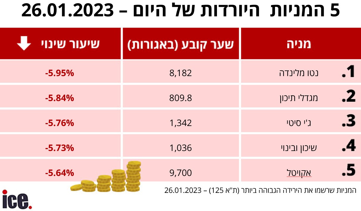 ענקית המזון נטו מלינדה ספגה ירידה בשיעור של 5.95% למחיר של 8,182 אג'; מגדלי הים התיכון ירדה בשיעור של 5.84% למחיר של 809.8 אג'; מנהלת מרכזי הקניות ג'י סיטי ירדה בשיעור של 5.76% למחיר של 1,342 אג'; שיכון ובינוי רשמה ירידה בשיעור של 5.73% למחיר של 1,036 אג'; וחברת חיפושי הנפט אקויטל ירדה בשיעור של 5.64% למחיר של 9,700 אג'.