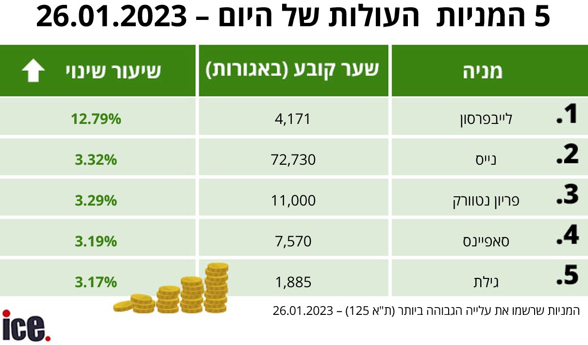 לייבפרסון, שביצעה הבוקר התאמת החזקות, רשמה זינוק אדיר של 12.79% במחיר המניה, ל-4,171 אג'; חברת התוכנה נייס עלתה בשיעור של 3.32% למחיר של 72,730 אג'; חברת כלי הפרסום באפליקציות פריון נטוורק עלתה בשיעור של 3.29% למחיר של 11,000 אג'; ספקית התוכנה הפיננסית סאפיינס עלתה בשיעור של 3.19% למחיר של 7,570 אג'; וענקית תקשורת הלוויינים גילת עלתה בשיעור של 3.17% למחיר של 1,885 אג'.
