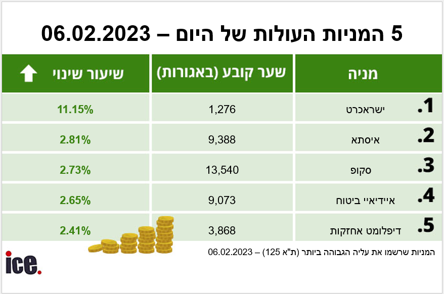 במקום השני: מניית איסתא שעלתה ב-2.81% לשער של 9,388 אג'. אחריה: סקופ עם עלייה של 2.73% לשער של 13,540 אג'. במקום הרביעי: איידיאיי ביטוח שעולה בשיעור של 2.65% לשער של 9073 אג'. סוגרת את הרשימה: דיפלומט אחזקות שעולה בשיעור של 2.41% לשער של 3,868 אג'.