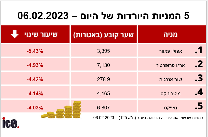 במקום השלישי: שוב אנרגיה עם ירידה של 4.42% לשער של 278.9 אג'. אחריה: מניית מיטרוניקס עם ירידה של 4.14% לשער של 4,165 אג'. סוגרת את הרשימה: נאייקס שיורדת היום ב-4.03% לשער של 6,807 אג'.