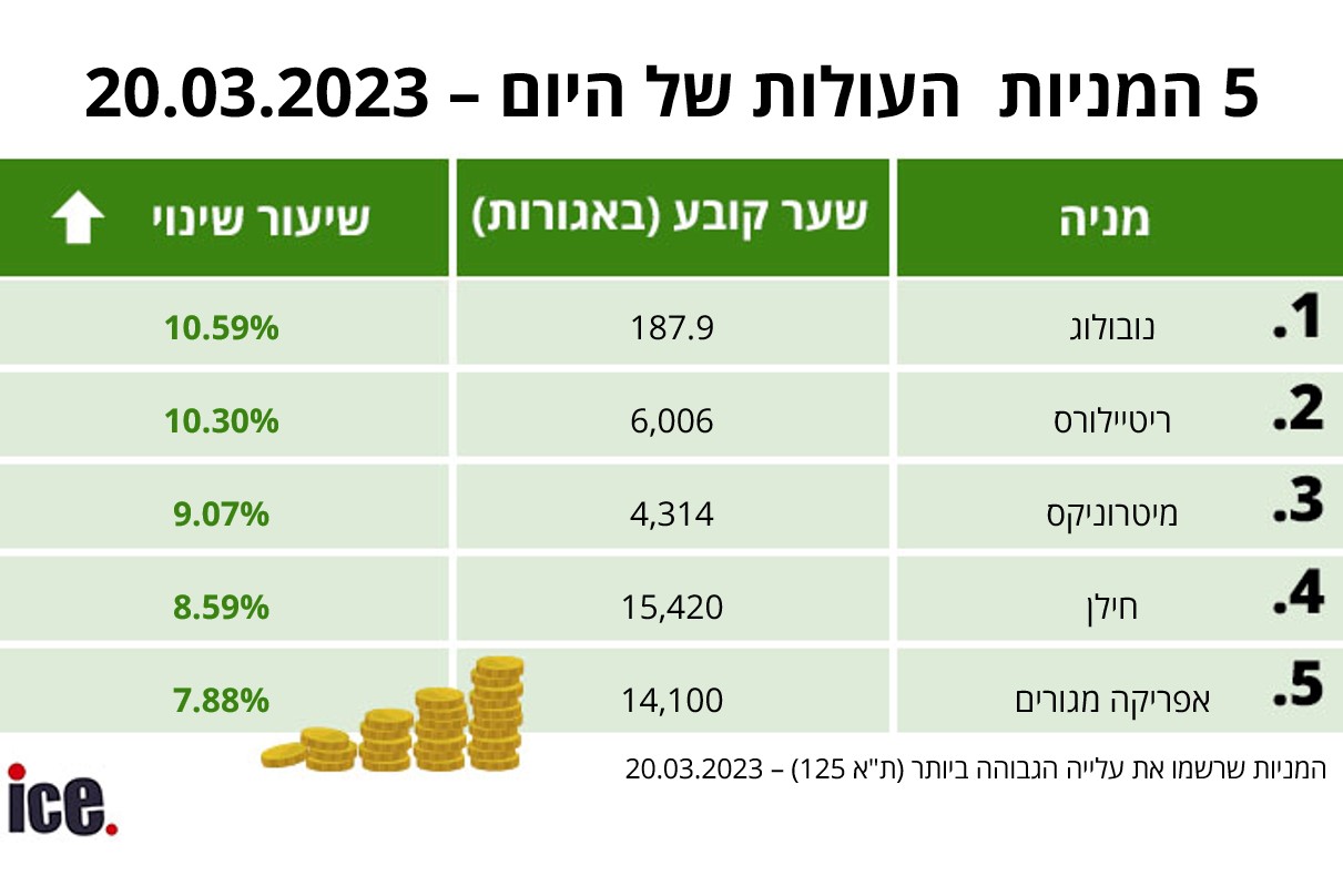 את חמשת המניות הבולטות של היום במדד ת"א 125, מובילה המניה של נובולוג עם עליה של 10.59% לרמה של 187.9 נקודות. צמוד במקום השני נמצאת ריטיילורס, אשר עלתה ב-10.30% לרמה של 6,006 נקודות.