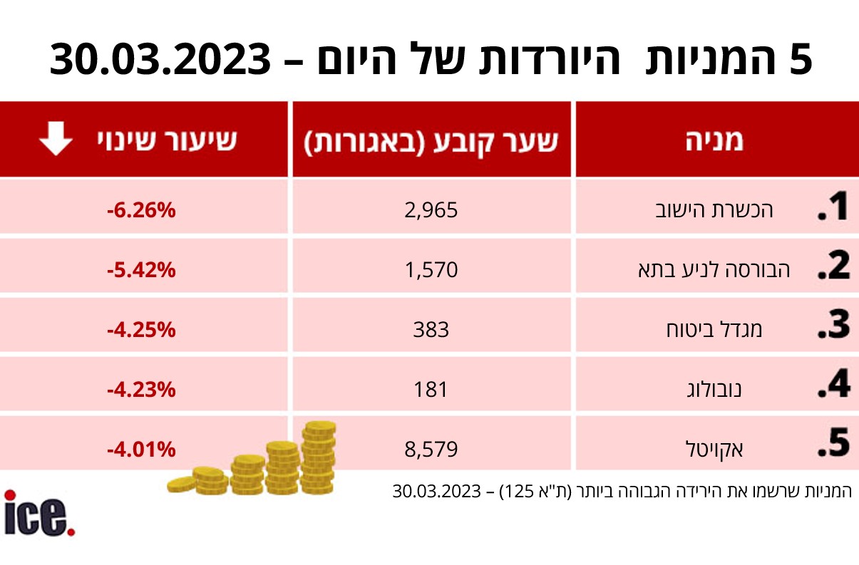 בראש המניות היורדות נמצאת הכשרת ישוב שאיבדה היום 6.26% מערכה וירדה לרמה של 2,965 נקודות. במקום השני נמצאת הבורסה עצמה, שירדה ב-5.42% לרמה של 1,570.