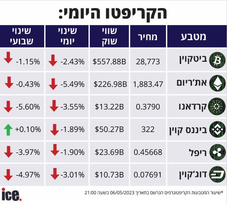 לאחר האופטימיות הזהירה שהחלה לאחר ההתייצבות של המטבעות הגדולים, כל המטבעות חוזרים להיצבע באדום: המטבע הגדול, הביטקוין, יורד ב-2.43% וכעת הוא שווה 28,773 דולר. שווי השוק של המטבע עומד כעת על 557.88 מיליארד דולר.