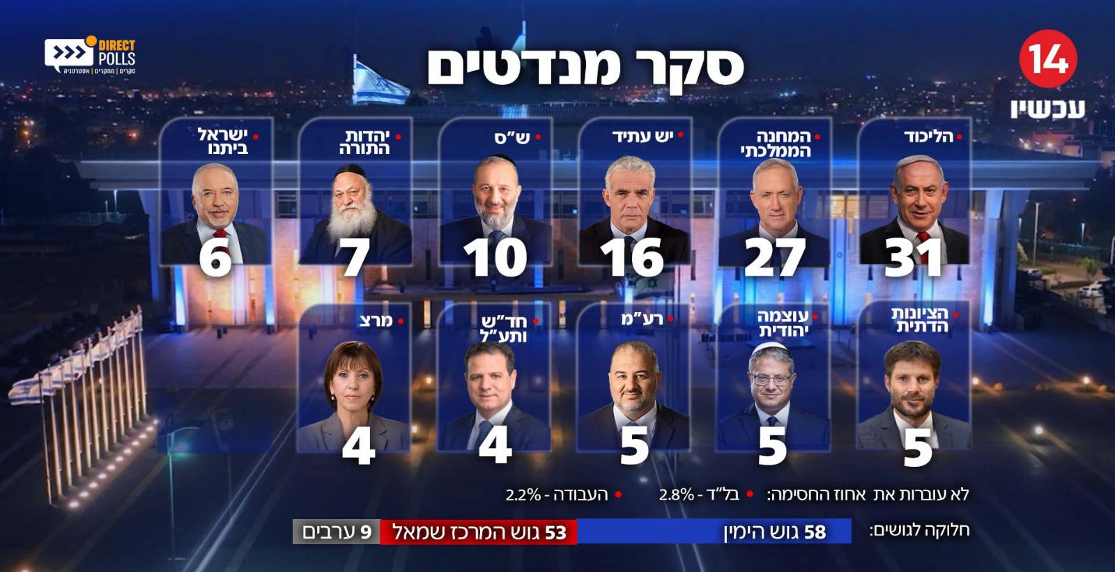 תוצאות הסקר המפתיע של חדשות עכשיו 14, בביצוע מכון דיירקט פולס, מציגות הערב (ראשון) תמונה מעניינת במיוחד של המערכת הפוליטית. על פי תוצאות הסקר גוש הימין עומד על 58 מנדטים. גוש המרכז שמאל על 53 מנדטים והמפלגות הערביות על 9 מנדטים. הציונות הדתית של סמוטריץ׳ נחלשת ל-5 מנדטים, אותה כמות המנדטים כמו לעצמה יהודית של איתמר בן גביר.