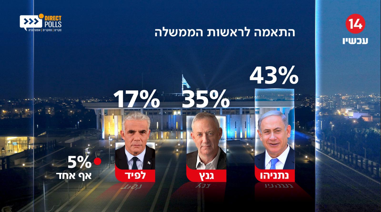 בשאלת ההתאמה לראשות הממשלה, נתניהו מצמצם את הפער מגנץ ל-2%, כאשר בשאלה המשולשת נתניהו עדיין מוביל. הסקר נערך היום 14.5.23, בקרב 622 משתתפים בוגרים שמייצגים את כלל האוכלוסייה.