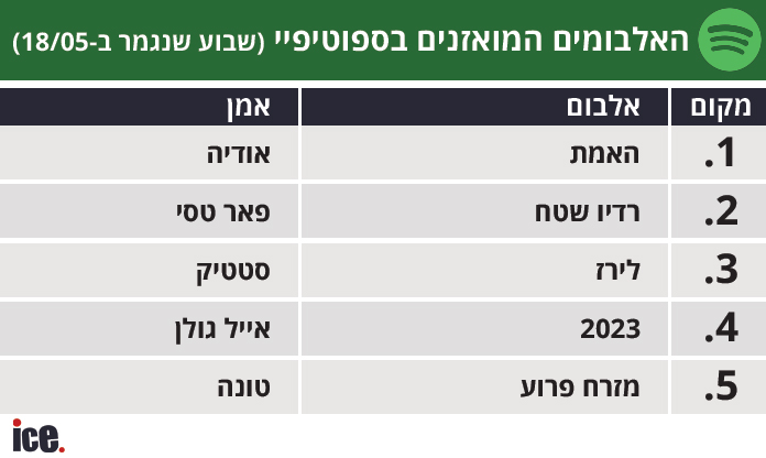 "האמת" של אודיה פותח את רשימת "האלבומים המואזנים ביותר", "רדיו שטח" של פאר טסי עולה ומגיע למקום השני, "לירז" של סטטיק מחליף את רדיו שטח ויורד למקום השלישי. במקום השלישי והרביעי נמצאים "2023" של אייל גולן ו"מזרח פרוע" של טונה בהתאמה.