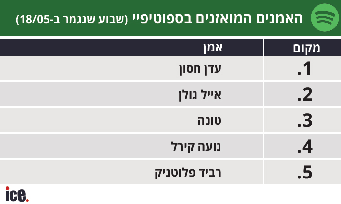 ברשימת האומנים המואזנים ביותר השבוע בספוטיפיי המצב מוכר מעט יותר, עדן חסון שומר על מקומו במקום הראשון, כך גם אייל גולן שנשאר במקום השני וטונה שנמצא במקום השלישי. נועה קירל עולה לא פחות מ-7 מקומות למקום הרביעי ורביד פלוטניק מצליח לעלות שתי מקומות ולעלות לחמישיה, אולי על רקע סדרת המופעים המשותפים שלו ושל טונה.