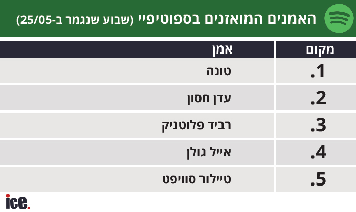 על רקע סבב ההופעות המשותף המצליח של טונה ורביד פלוטניק, טונה עולה מהמקום השלישי ישירות אל המקום הראשון וכובש את הפסגה בדירוג האמנים המואזנים ביותר השבוע. מיד אחריו עדן חסון שירד למקום השני ורביד פלוטניק שזינק בשתי מקומות אל המקום השלישי. אייל גולן וטיילור סוויפט סוגרים את הרשימה כאשר הם מגיעים למקום הרביעי והחמישי, בהתאמה.
