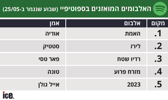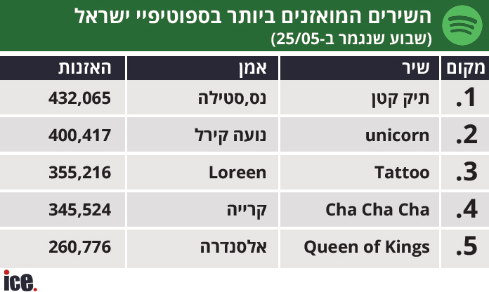 את דירוג השירים המואזנים ביותר בספוטיפיי השבוע פותח במקום הראשון הלהיט של נס וסטילה, "תיק קטן" שעולה ישר מהמקום הרביעי. למרות שעברו שבועיים מהאירוויזיון, נראה שההתלהבות סביבו טרם דעכה. במקום השני נמצא השיר שייצג אותנו בתחרות השירים, "Unicorn" של נועה קירל, איתו זכתה במקום השלישי.