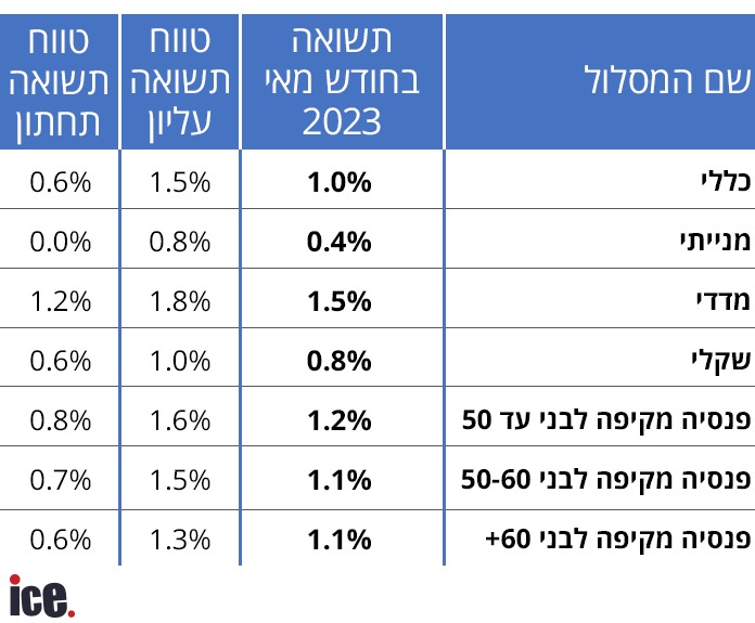 עוד עולה מנתוני מיטב כי טווח התשואות של כלל הקופות אמור לנוע במנעד רחב מאוד של בין תשואה של 0.6% לבין תשואה של 1.5%. בסך הכל בחודש מאי נרשמה בארה"ב מגמה מעורבת כאשר מדד הדאו ירד ב-3.5%, מדד ה-S&P עלה ב-0.3% ומדד הנאסד"ק עלה באופן חד של 5.8%. באירופה נרשמה מגמה שלילית כשה-DAX הגרמני ירד ב-0.9%, ה-CAC הצרפתי ירד ב-5.3% וה-Eurostoxx 50 ירד ב-3.2%.
