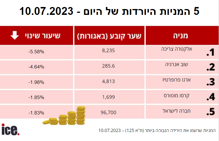 בקרב המניות הבולטות שרשמו ירידות היום, ניתן לציין את זו של אלקטרה צריכה, אשר ירדה ב-5.58% לרמה של 8,235 נקודות. שוב אנרגיה רשמה ירידה של 4.64% לרמת 285.6 נקודות. ארגו פרופרטיז ירדה ב-1.98% לרמה של 4,813 נקודות. המניה של קרסו מוטורס רשמה ירידה של 1.85% לרמת 1,699 נקודות. המניה של חברה לישראל ירדה ב-1.83% לרמה של 96,700 נקודות.