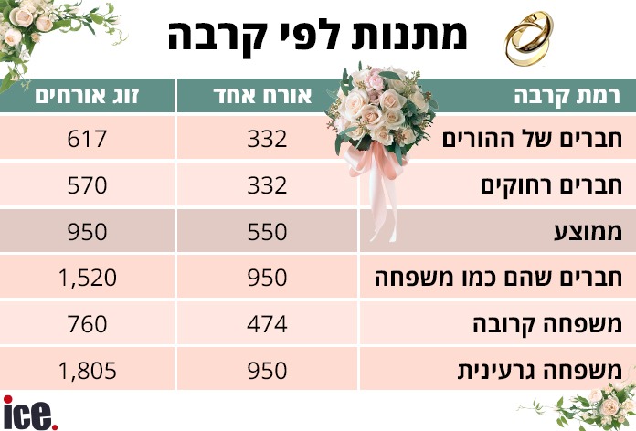 נתוני החברה שפורסמו ב-ynet, מעידים כי סכום המתנה משתנה בין אזורים שונים בארץ, לפי רמת קרבה ועוד. למשל, אורח יחיד מהמשפחה הגרעינית או אורח שהוא חבר קרוב ברמת משפחה ישים בממוצע כ-950 שקל. מנגד, אורח יחיד ממשפחה קרובה ישים רק 474 שקל. מהצד השני של הסקאלה נמצאים חברים רחוקים או חברים של ההורים שישימו כ-332 שקל. הממוצע הכולל לאורח יחיד יעמוד על 550 שקל, ומתנה של זוג תעמוד על כ-950 שקל.
