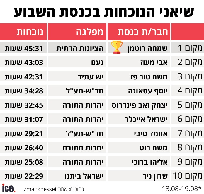 ח"כ שמחה רוטמן כובש את הפסגה עם 45:31 שעות נוכחות במליאה, אחריו במקום השני מתברג ח"כ אבי מעוז מנעם עם: 43:03 שעות נוכחות ובמקום השלישי מתמקם ח"כ משה טור פז מיש עתיד עם: 42:31 שעות נוכחות ובמקום הרביעי בולט ח"כ יוסף עטאונה מרע"ם תע"ל עם: 34:28 שעות נוכחות ובמקום החמישי ח"כ יצחק פינדרוס מיהדות התורה עם: 32:45 שעות נוכחות.