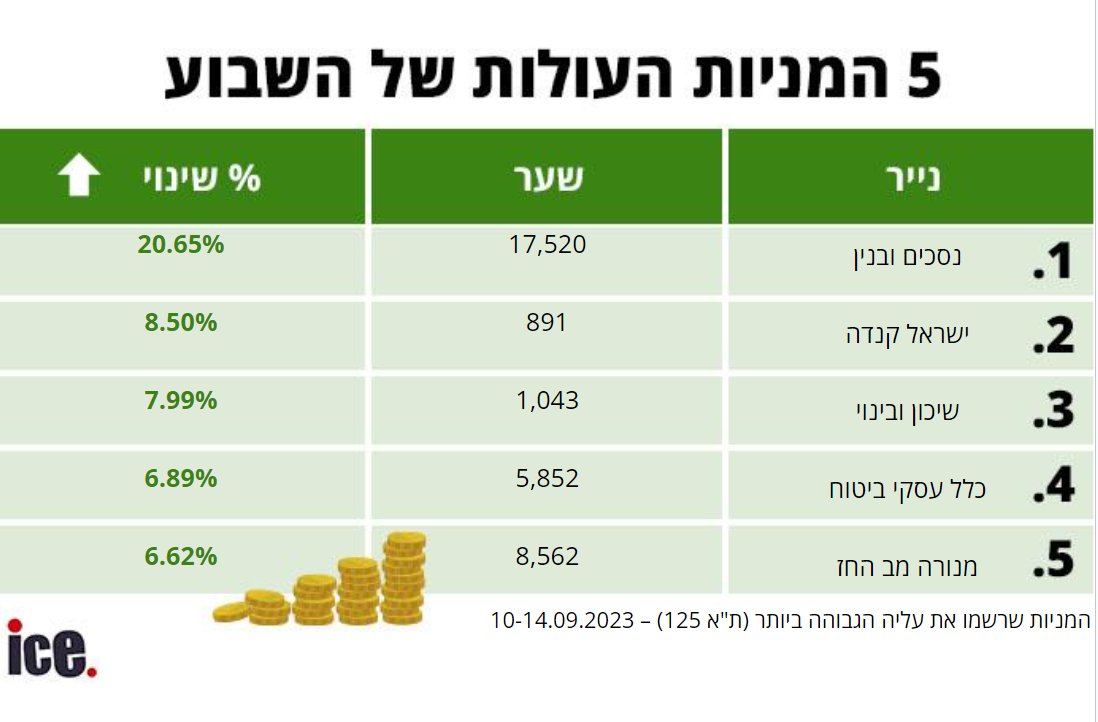 בקרב המניות הבולטות במדד ת"א 125 שרשמו עלייה השבוע, זו של נכסים ובניין נמצאת גבוה בצמרת, כאשר שזינקה בשיעור של 20.65% לרמת 17,520 נקודות, לאחר שדסק"ש רכשה מניות ההחברה ב-20 מיליון שקל ועלתה להחזקה של כמעט 65% מהחברה. במקומות השני והשלישי נמצאות שתי חברות נדל"ן נוספות: ישראל קנדה ושיכון ובינוי, עם תשואות בגובה 8.5% ו-7.99% בהתאמה. חברות הביטוח כלל ומנורה משלימות את חמישיית המובילות.