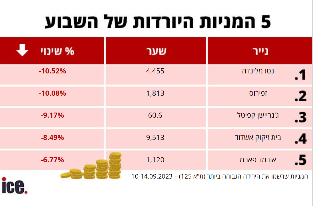 בקרב המניות הבולטות במדד ת"א 125 שרשמו ירידה השבוע, זו של נטו מלינדה נמצאת בצמרת הלא מחמיאה, לאחר שירדה בשיעור של 10.52% לרמת 4,455 נקודות, מה שממשיך את התקופה הרעה של החברה. זפירוס מעט מאחוריה, עם ירידה בגובה 10.08% לרמה של 1,813 נקודות. ג'נריישן קפיטל רשמה ירידה בשיעור של 9.17% לרמת 60.6 נקודות. המניות של בית זיקוק אשדוד ואורמד משלימות את חמישיית המאכזבות.