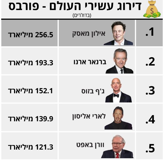 לאחר מגמה מעורבת של ירידות ועליות בשבוע שעבר, החמישייה הפותחת של עשירי העולם - כולה - רושמת ירידה בהון. אילון מאסק שעדיין מככב במקום הראשון וזוכה לתואר האדם העשיר בעולם מאבד השבוע 1.88% מהונו ומגיע ל-256.5 מיליארד דולר.