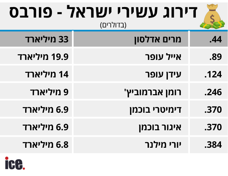 מרים אדלסון לא זזה מהפסגה והונה האישי מוערך על ידי מגזין "פורבס" בכ-33 מיליארד דולר. רומן אברמוביץ' חוטף מכה קלה בכנף שמותירה אותו במקום ה-246 ברשימה העולמית. יורי מילנר יציב במקומו, ומה מצבם של האחים בוכמן?