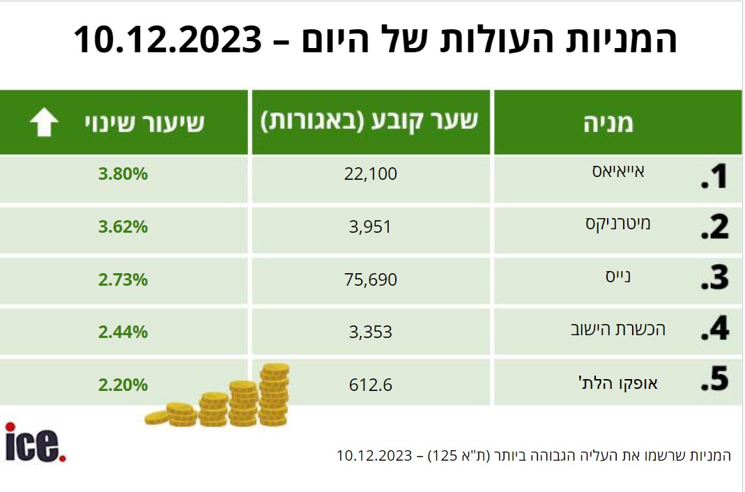 אחריה נמצאת מניית נייס עם עלייה של 2.73% לרמה של 75,690 נקודות. הרביעית ברשימת המניות העולות היא מניית הכשרת הישוב עם עלייה של 2.44% לרמה של 3,353 נקודות ומי שסוגרת את החמישייה הראשונה היא מניית אופקו הלת' עם עלייה של 2.20% לרמה של 612.6 נקודות.