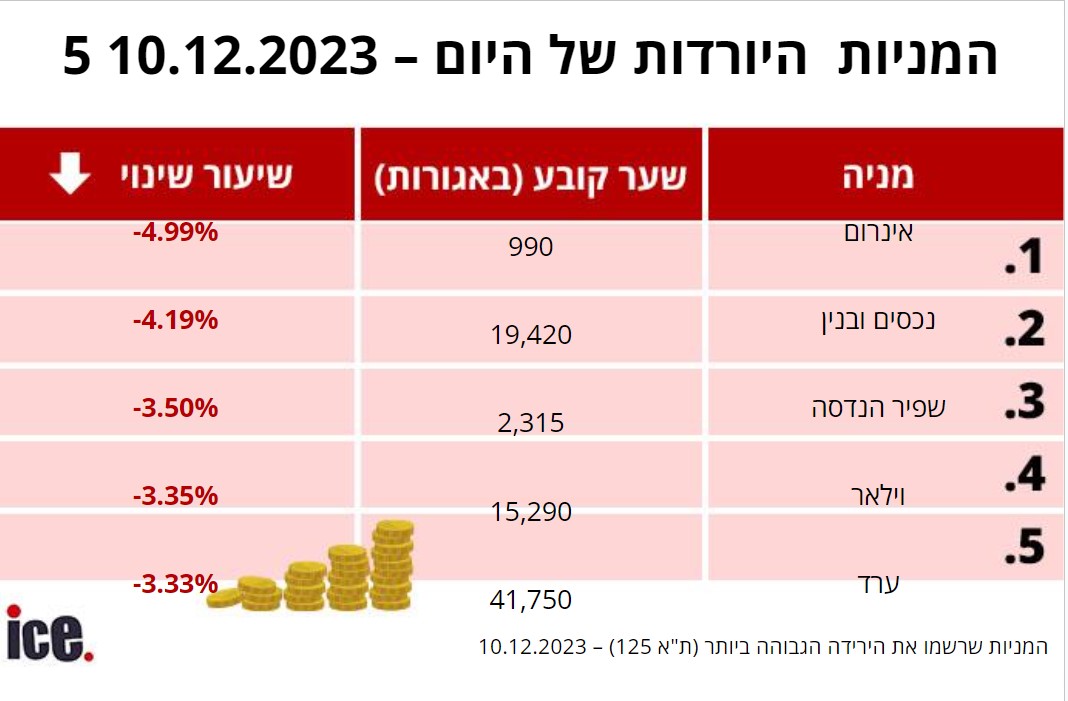 ברשימת היורדות ראשונה ברשימה היא מניית אינרום עם ירידה של 4.99% לרמה של 990 נקודות כשאחריה נמצאת מניית מניית נכסים ובנין עם ירידה של 4.19% לרמה של 19,420 נקודות.
