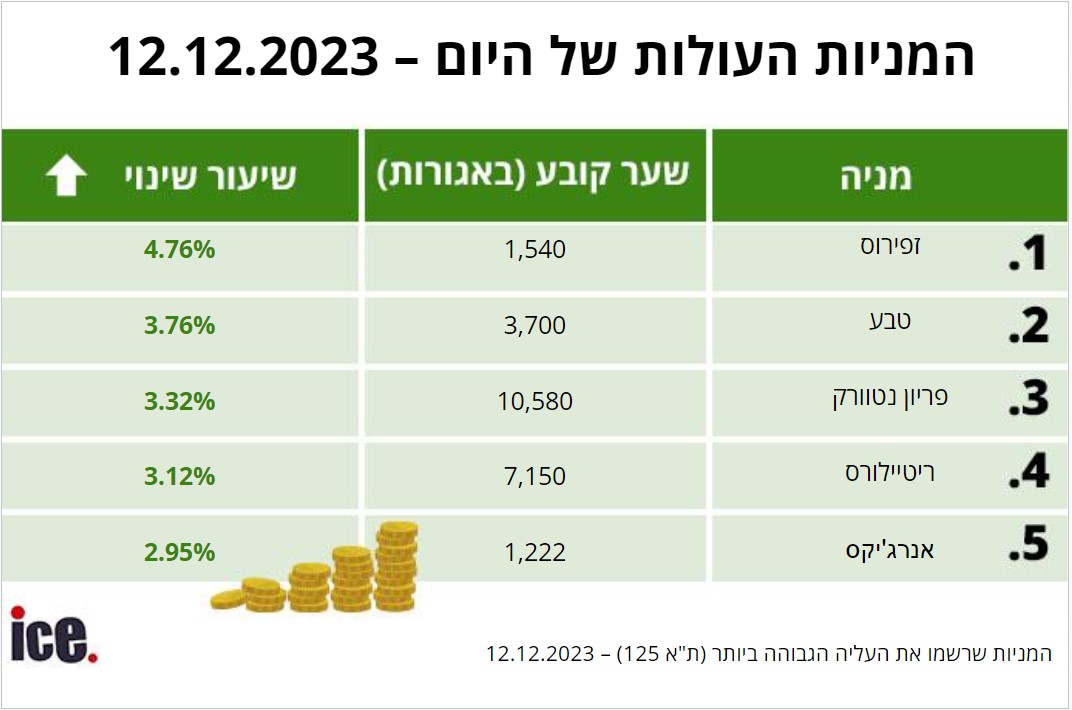 חמשת המניות העולות באחוזים הגבוהים ביותר היום, במדד ת"א 125 הן זפירוס, טבע, פריון נטוורק, ריטיילורס ואנרג'יק. מניית זפירוס היא המנצחת הגדולה של היום עם עלייה של 4.76% וכעת היא נסחרת ברמה של 1,540 נקודות, כאשר אחריה נמצאת מניית טבע שעלתה היום ב-3.76% ונסחרת ברמה של 3,700 נקודות.