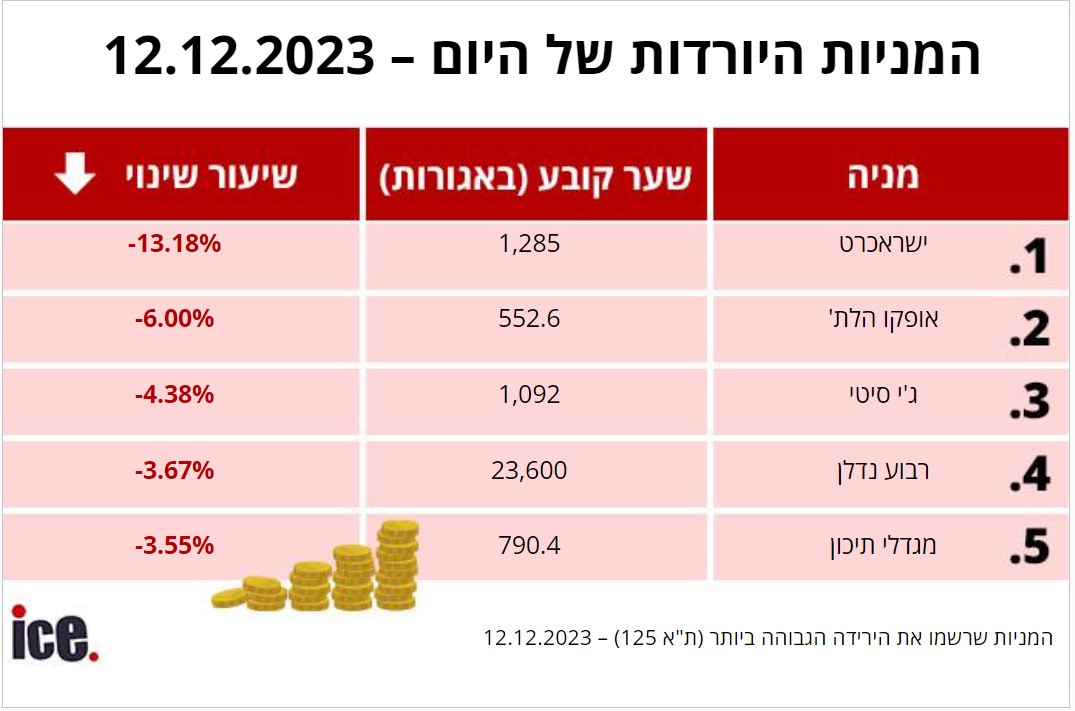 את טבלת המניות היורדות הובילה באופן מובהק מניית ישראכרט, שצללה היום ב-13.18% לרמה של 1,285 נקודות, כאשר אחריה מניית אופקו הלת' עם ירידה של 6% לרמה של 552.6 נקודות.
