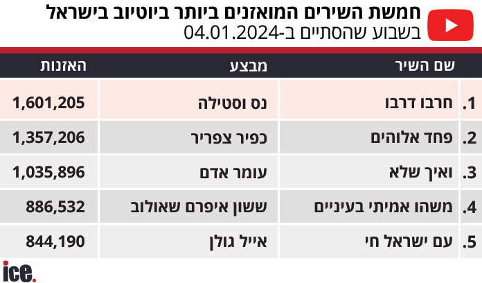 היום (ראשון), פורסם הדירוג של "יוטיוב" בקטגוריית השירים הכי מואזנים בפלטפורמה בישראל. על פי הנתונים עולה כי במקום הראשון נמצא השיר "חרבו דרבו" של צמד המוסיקאים נס וסטילה, עם שיא של 1,601,205 במספר ההאזנות. למקום השני, הגיע הזמר הצעיר כפיר צפריר עם השיר "פחד אלוהים". על פי נתוני יוטיוב, השיר זכה ל-1,357,206 האזנות באתר.
