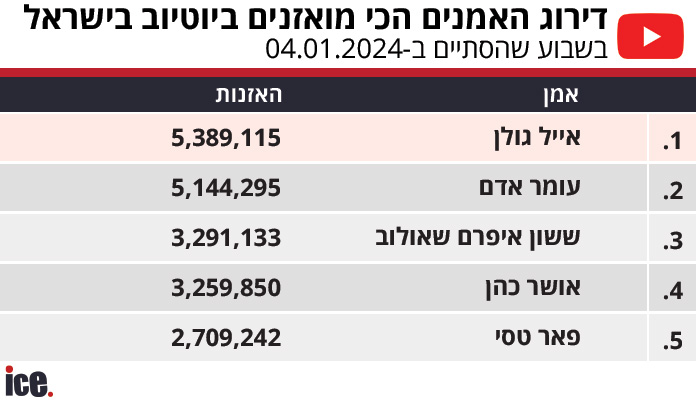 כמו כן, ברשימת האומנים המואזנים ביותר ביוטיוב מופיע הזמר אייל גולן, שכובש את המקום הראשון בטבלה שבוע לאחר שבוע. גולן, גרף הישג משמעותי בכל הנוגע להאזנות אשר הסתכמו בשיא של 5,389,115 האזנות.
