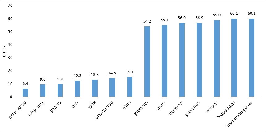 בפילוח לפי יישובים (בהם מתגוררים למעלה מ-20 אלף תושבים), עולה כי אחוז בעלי ההשכלה האקדמית הגבוה ביותר הוא במודיעין-מכבים-רעות ובגבעת שמואל (60.1%). את שלישיית הצמרת סוגרת גבעתיים עם 59%. לעומת זאת, הערים בעלי השיעור הנמוך ביותר של השכלה גבוהה הן חרדיות: מודיעין עילית (6.4%), ביתר עילית (9.6%) ובני ברק (9.8%).