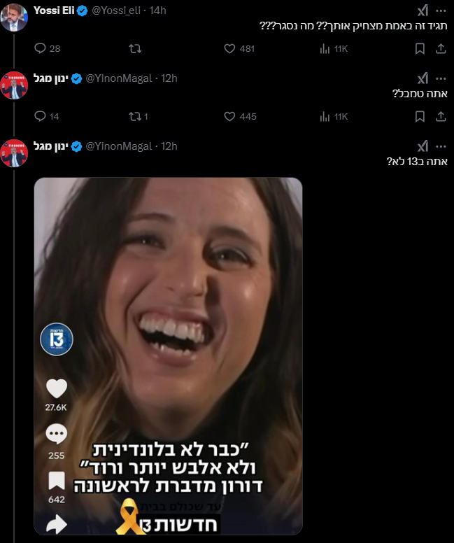 מגיש הפטריוטים בערוץ 14 הותקף הבוקר מכל כיוון בעקבות ציוץ שלו, אותו פירשו ברחבי הרשת כאילו הוא מציג גיחוך מצידו, על דברי החטופה ששבה הביתה, דורון שטיינברכר. אחד המגיבים היה עיתונאי חדשות 13, שלו ינון מגל לא נשאר חייב
