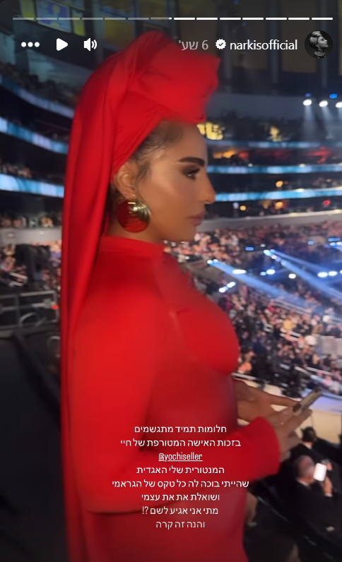 נרקיס בטקס הגראמי עם סיכת החטופים: "חלומות תמיד מתגשמים"