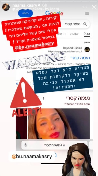 הערב (חמישי) נעמה קסרי הזהירה את הלקוחות שלה מפני קליניקה שמתחזה לה, כאשר בסטורי שהעלתה לחשבון האינסטגרם שלה, היא צירפה צילום מסך מתוך בגוגל, שם בחיפוש הראשון כשכותבים נעמה קסרי נמצאת הקליניקה המתחזה.