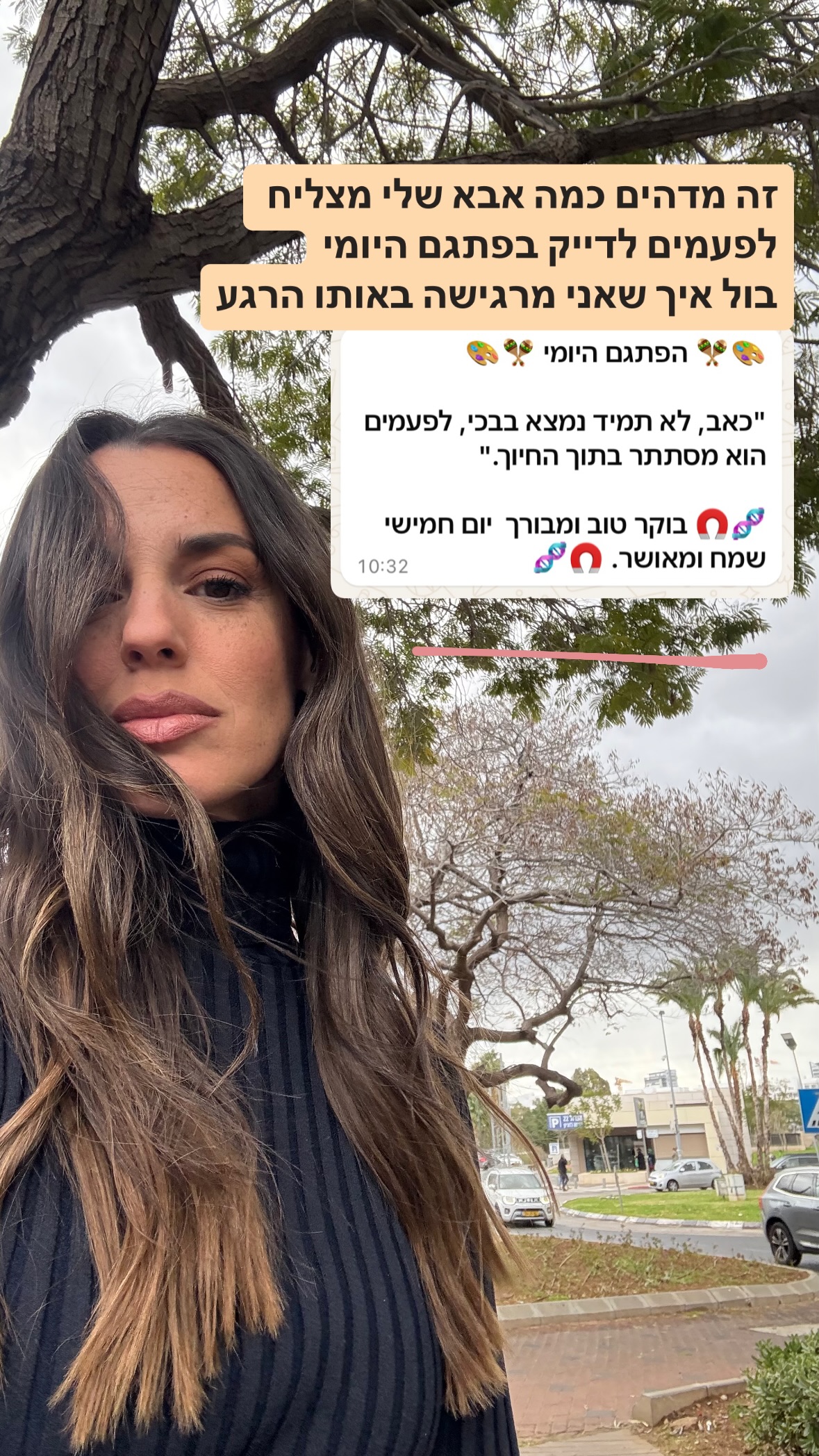 אל הסטורי שהעלתה מגישת הטלוויזיה ברשת 13 היא צירפה תמונה שלה וכתבה: "זה מדהים כמה אבא שלי מצליח לפעמים לדייק בפתגם היומי שלו בול איך שאני מרגישה באותו רגע".