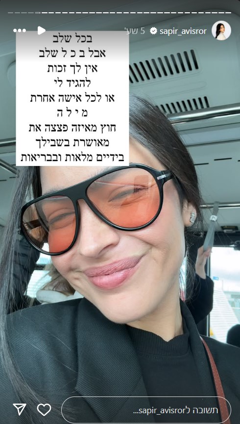 לסיום העלתה סטורי עם תמונה שלה ובו תקפה: "בכל שלב, אבל בכל שלב - אין לך זכות להגיד לי או לכל אישה אחת מילה, חוץ מאיזה פצצה את, אני מאושרת בשבילך בידיים מלאות ובבריאות".