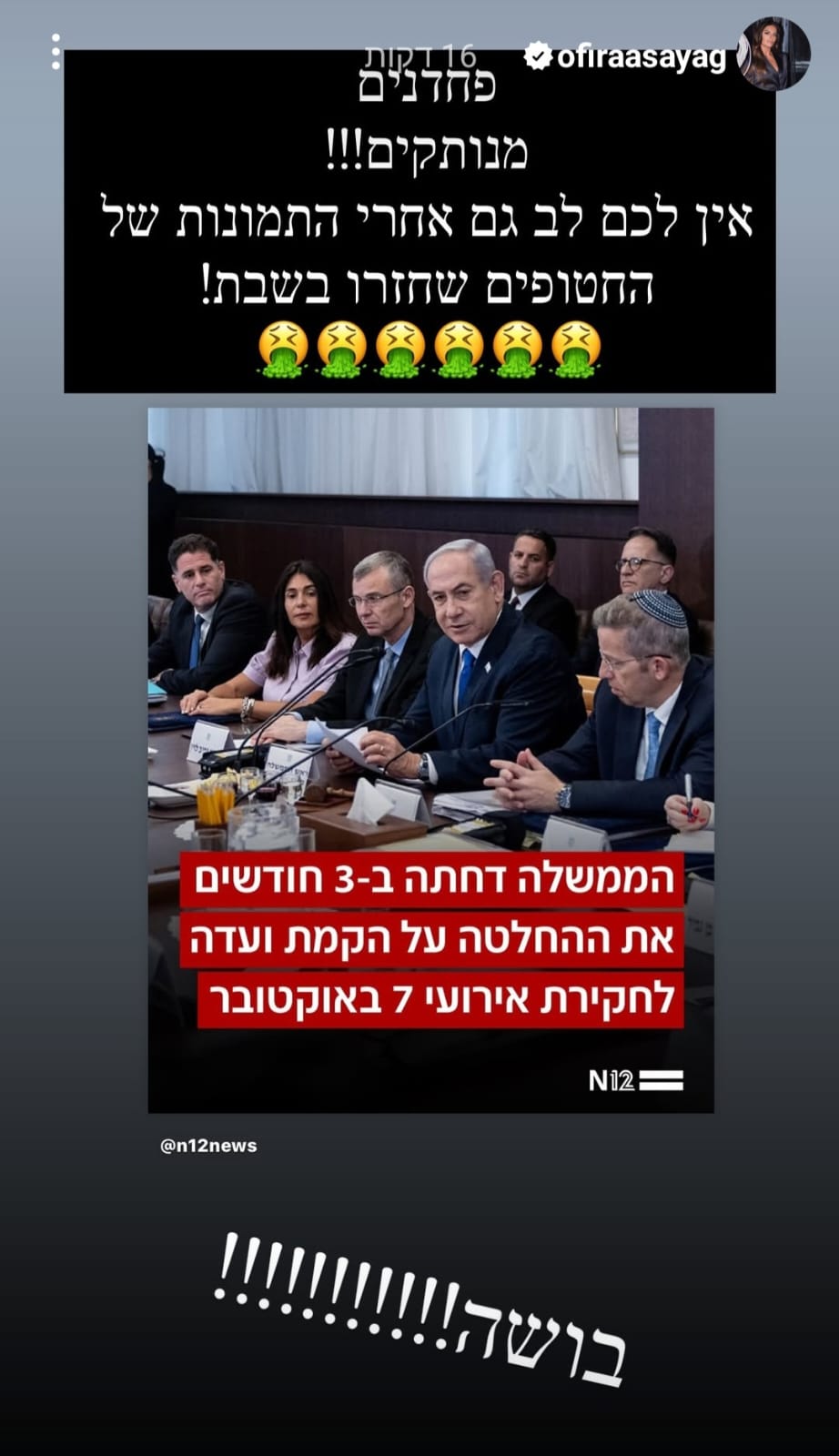אופירה אסייג לא פוחדת להגיד את דעתה וגם הבוקר היא מנצלת את הסטורי כדי להביע את זעמה. לאחר שפורסם כי הממשלה החליטה לדחות בשלושה חודשים את הקמת הוועדה לחקירת אירועי ה-7 באוקטובר.