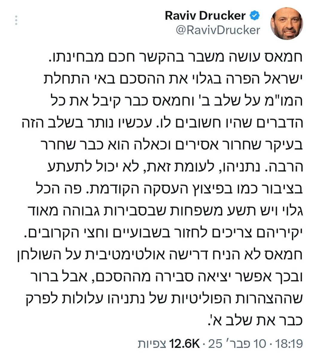 בטוויטר שלו כתב דרוקר: "חמאס עושה משבר בהקשר חכם מבחינתו. ישראל הפרה בגלוי את ההסכם באי התחלת המו"מ על שלב ב' וחמאס כבר קיבל את כל הדברים שהיו חשובים לו. עכשיו נותר בשלב הזה בעיקר שחרור אסירים וכאלה הוא כבר שחרר הרבה. נתניהו, לעומת זאת, לא יכול לתעתע בציבור כמו בפיצוץ העסקה הקודמת".